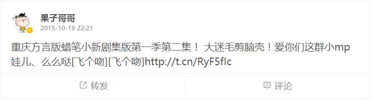 微博红人果子哥哥也是靠方言配音走红的典型例子,他的代表作《重庆方言版蜡笔小新》在微博上粉丝166万,单条转发过万。可见方言视频在中国有很强大的受众基础。但现在大多数up主,都是把方言作为一个选题,而不是一门常用语言来制作视频,方言视频的市场潜力还远远没被发掘出来。