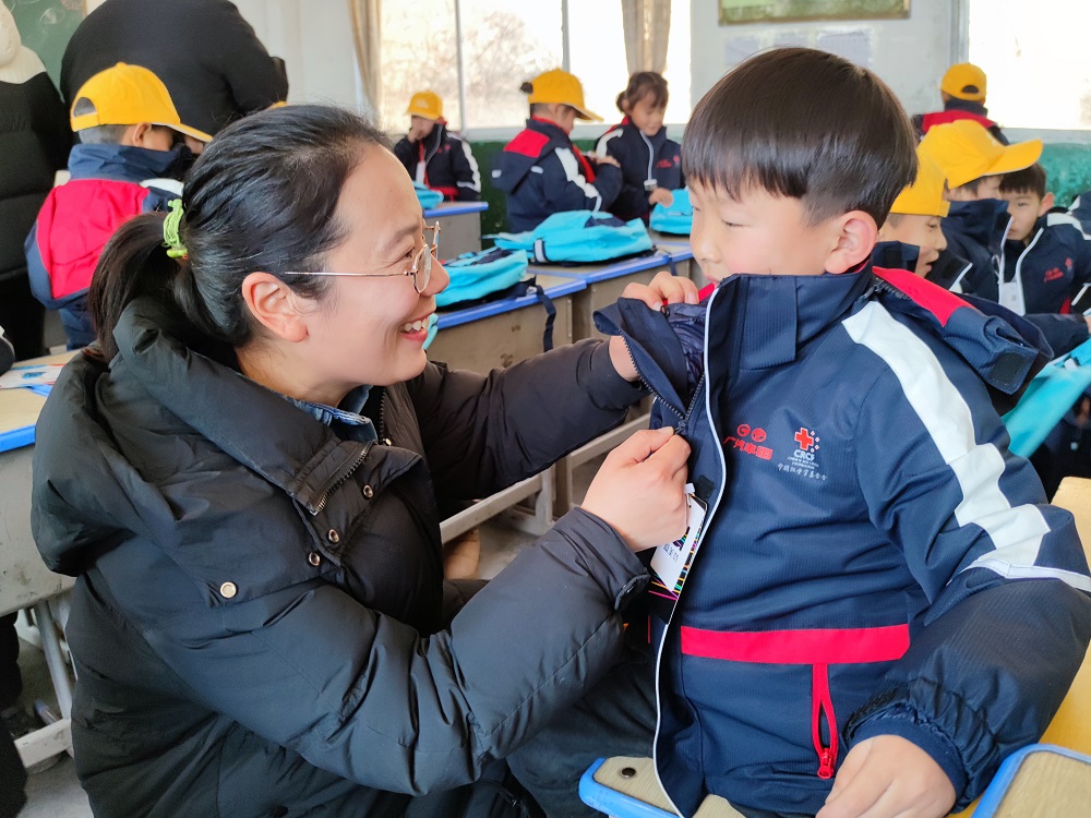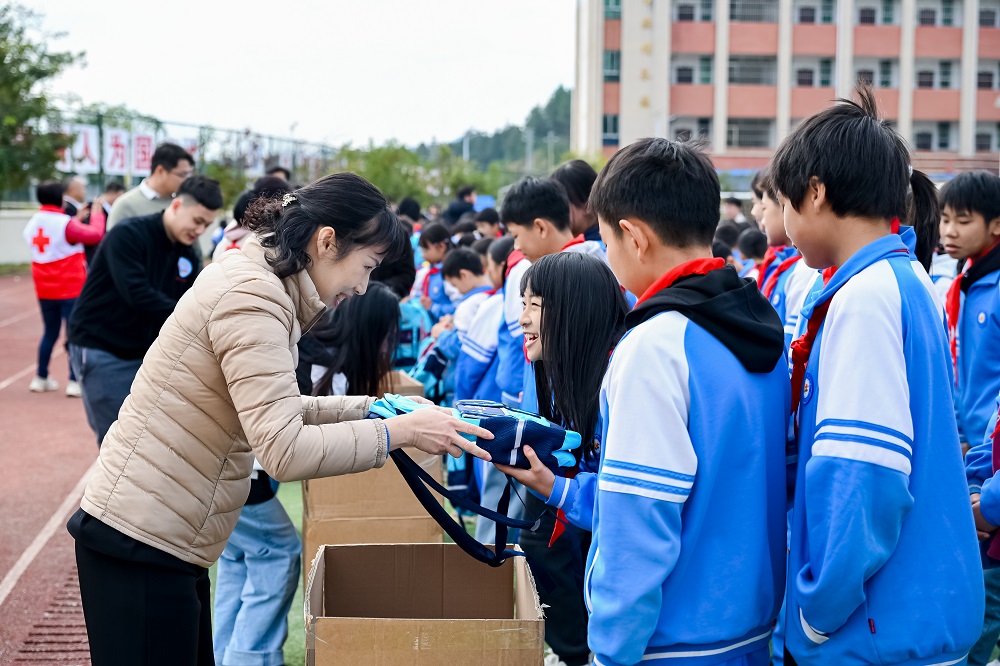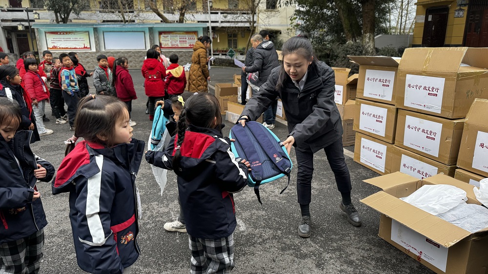 志愿者亲手为孩子们赠送安全书包,为他们的上学路多添一份安心