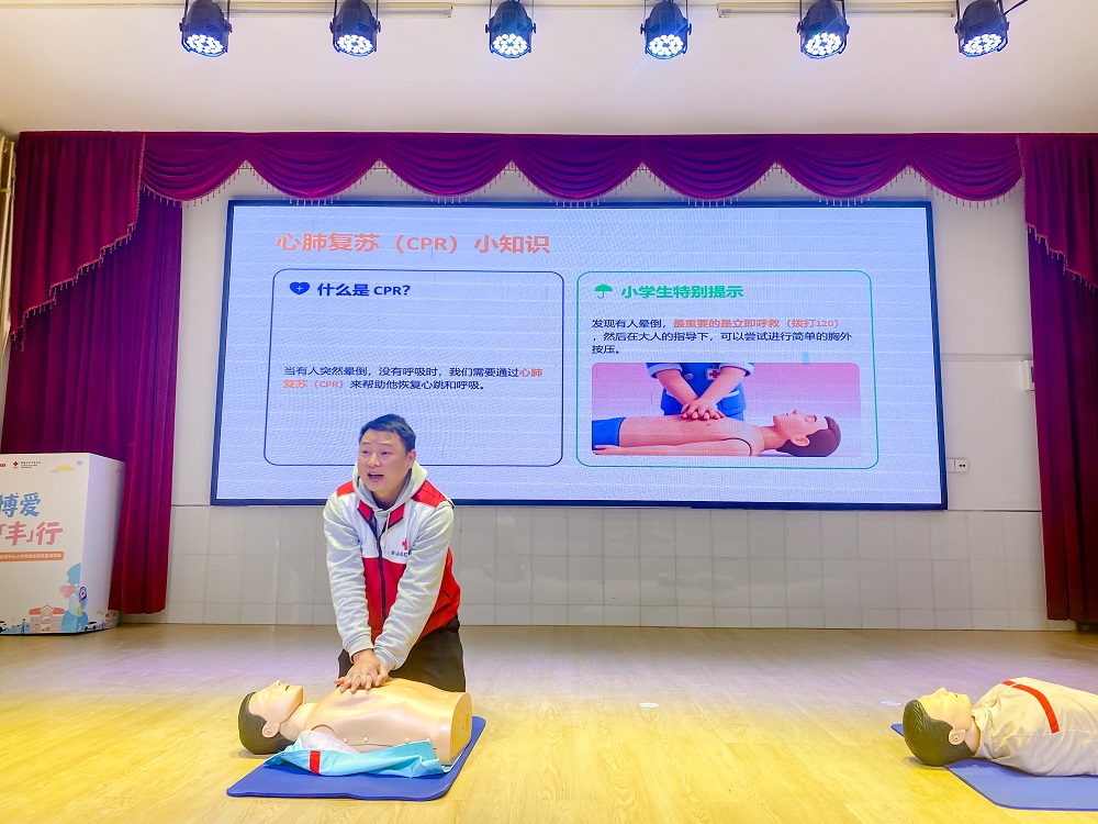中国红十字基金会专业讲师现场演示心肺复苏操作流程,让孩子们直观学习实用急救技能