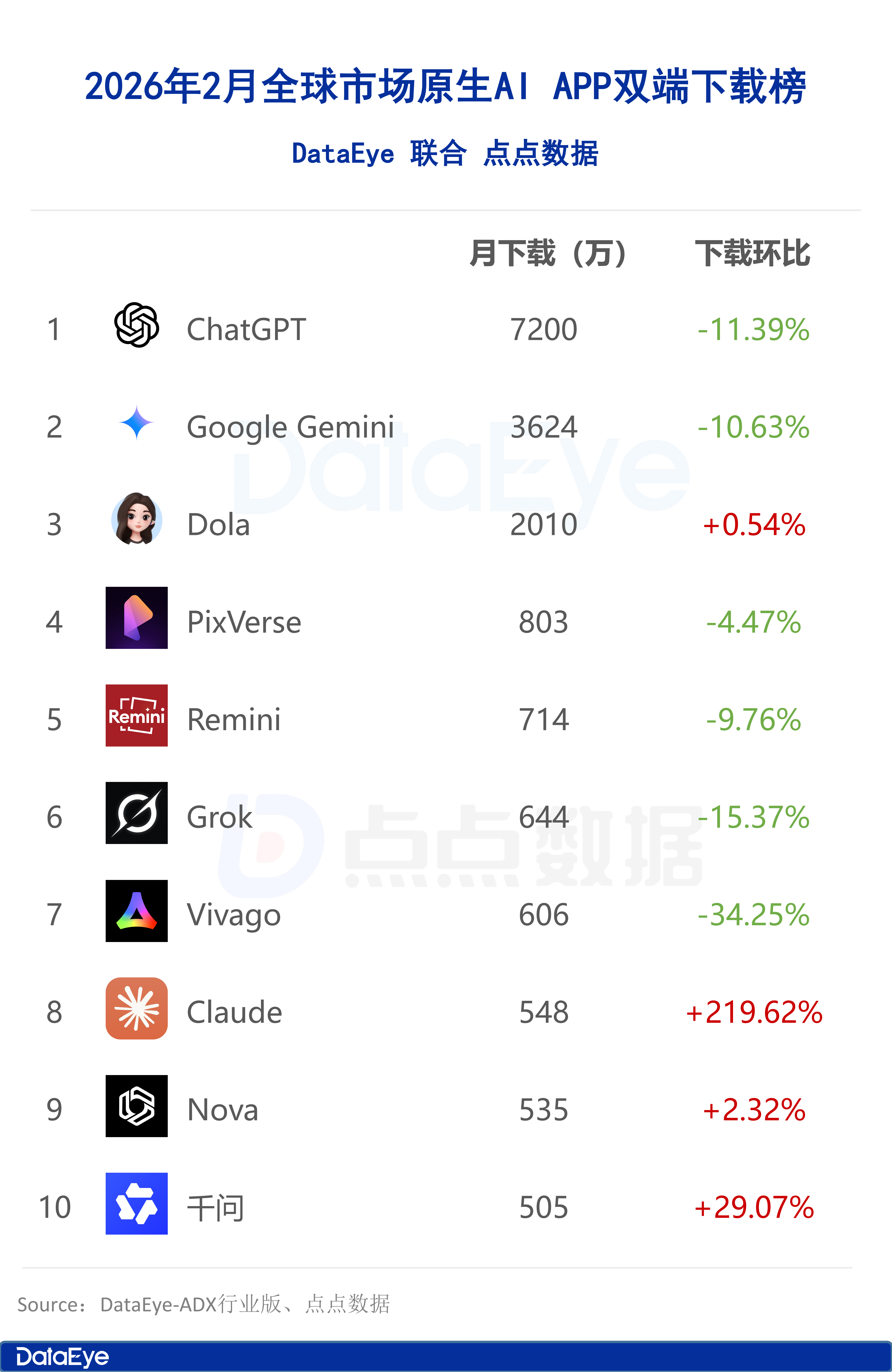 另外,2月份美国Anthropic开发的大语言模型产品Claude下载量迎来大幅增长,涨幅达219.62%,直接跻身榜单第八位,千问下载量同样迎来29.07%的环比增长,跻身榜单第十位,1月份榜单中即梦AI与蚂蚁阿福则跌出2月榜单。