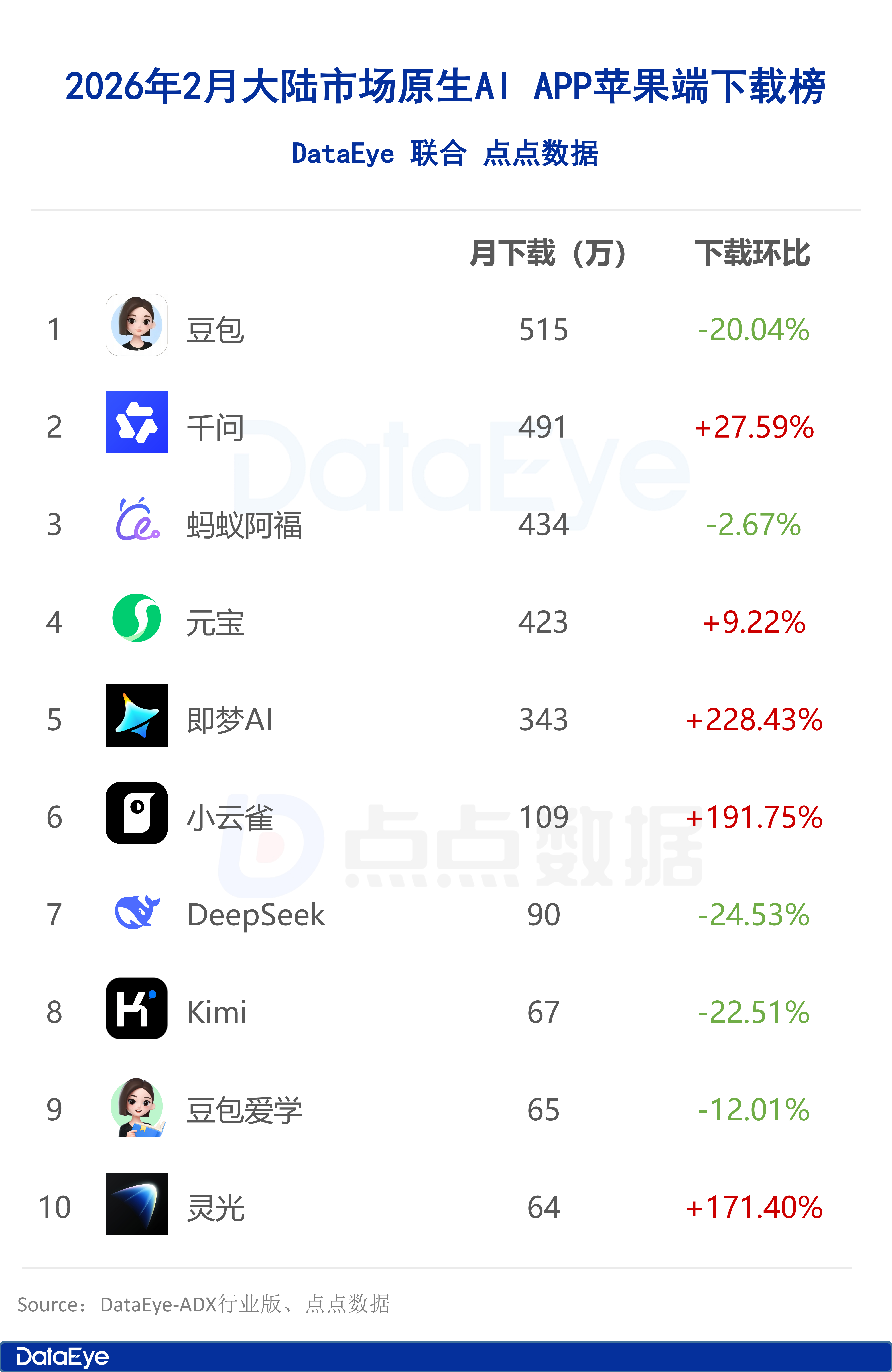 点点数据显示,2026年2月大陆市场苹果端原生AI APP下载量榜单由豆包蝉联榜首,下载量515万次,环比1月下滑20.04%,千问、蚂蚁阿福、元宝、即梦AI紧随其后,下载量均超300万次,其中即梦AI下载量环比大涨228.43%,跻身榜单TOP 5。