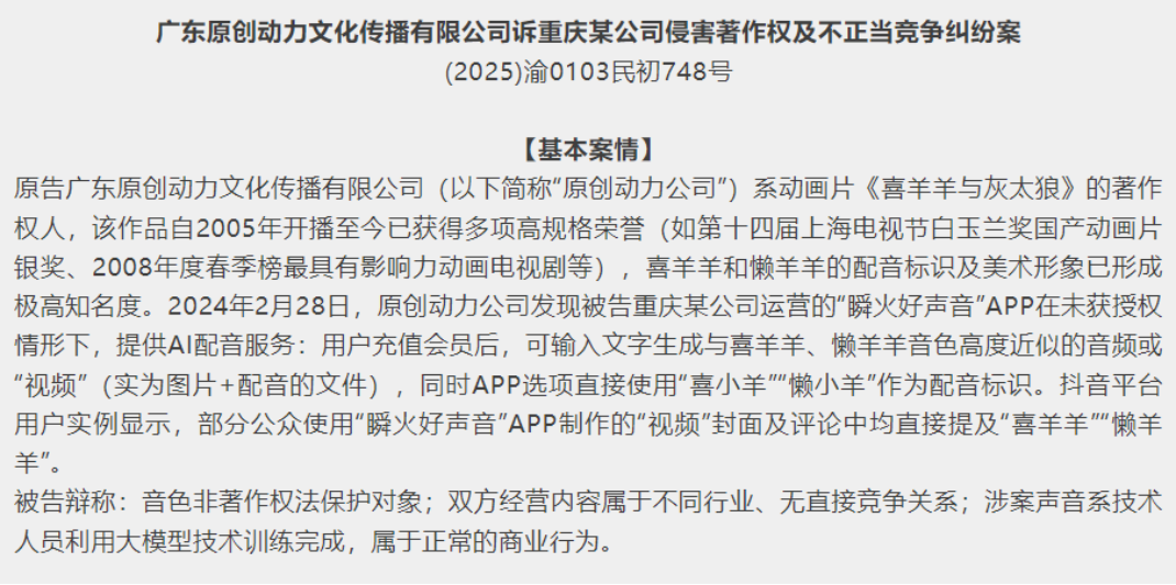 行业狂奔探索,法律监管也日趋严格。近日,杭州互联网法院就宣判全国首例AI配音侵权IP案,明确用AI模仿“喜羊羊”等IP角色的声音,一样算侵权。这意味着技术再新,也不是随便用别人IP的借口。想靠“蹭IP”来走捷径,未来的代价只会越来越高。反过来,深度的IP授权与合作,会变得越来越重要、越来越“值钱”。