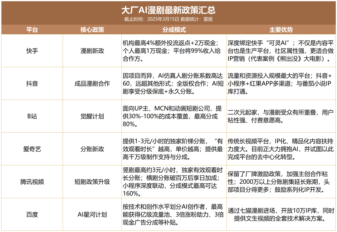 现在市面上主要的玩家,其实就是各大内容平台,每家打法不太一样。例如,抖音系的流量最大,算法最猛,是快速测试内容、制造爆款的绝对主战场;快手则深度绑定“可灵AI”,想从内容生产环节就抓住创作者,形成一个有特色的社区;B站、腾讯、爱奇艺等老牌长视频平台,用更高的分账比例和精品化的要求,吸引那些更有制作能力的团队,试图做出一些IP化、系列化的作品。