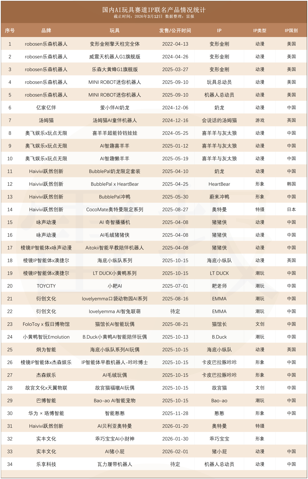 据雷报不完全统计,截至发稿日,市场上已有至少30款IP联动型AI玩具上线或官宣,且IP类型覆盖动漫、潮玩、形象、文创、特摄等多元领域。