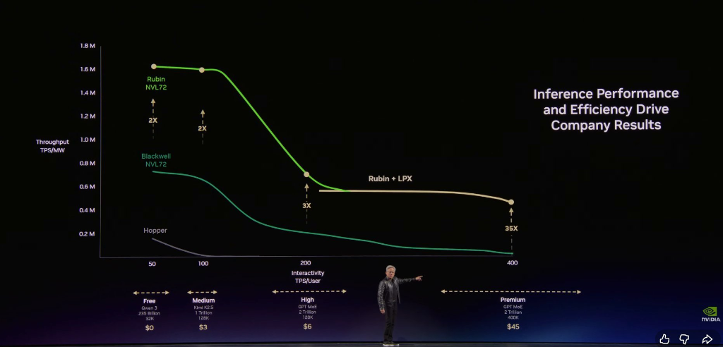GTC大会上,他用一张AI工厂的收益图,抓住所有CEO们敏锐的神经——纵轴是Token吞吐量,代表工厂的产能,横轴是Token速率,代表工厂的效能,两者的乘积等于AI工厂收入。Token就是新的商品,它会和任何工业品一样形成不同价格的成熟商品体系,重新划分公司的位置。