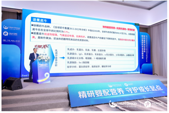 东北农业大学副校长、食品科学系教授姜毓君分享了“原料营养特性及婴幼儿配方乳粉品质提升关键技术研究进展”,他提到,优质奶源是品质基石,其中诺曼底牛奶源依托独特的品种基因背景,具备非常好的营养特性,是制备高品质婴幼儿配方乳粉的理想原料。