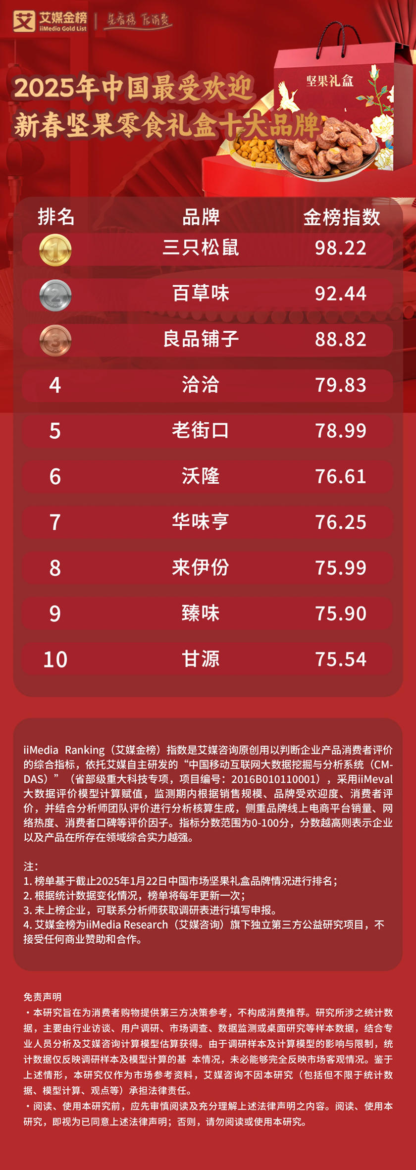 近日,随着一份新春坚果榜单的出炉,这家低调的青岛企业再次进入公众视野。iiMediaRanking(艾媒金榜)最新发布《2025年中国最受欢迎新春坚果零食礼盒十大品牌》,榜单TOP10分别为:三只松鼠、百草味、良品铺子、洽洽、老街口、沃隆、华味亨、来伊份、臻味、甘源。