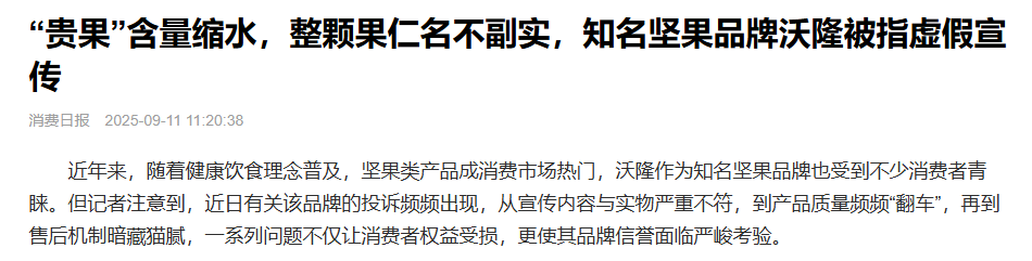 此外,沃隆坚果在2025年9月曾被《消费日报》指出部分产品存在宣传与实物不符的争议,其在小红书、黑猫投诉等平台上,有多条关于沃隆的内容直指“宣传与实际不符”。