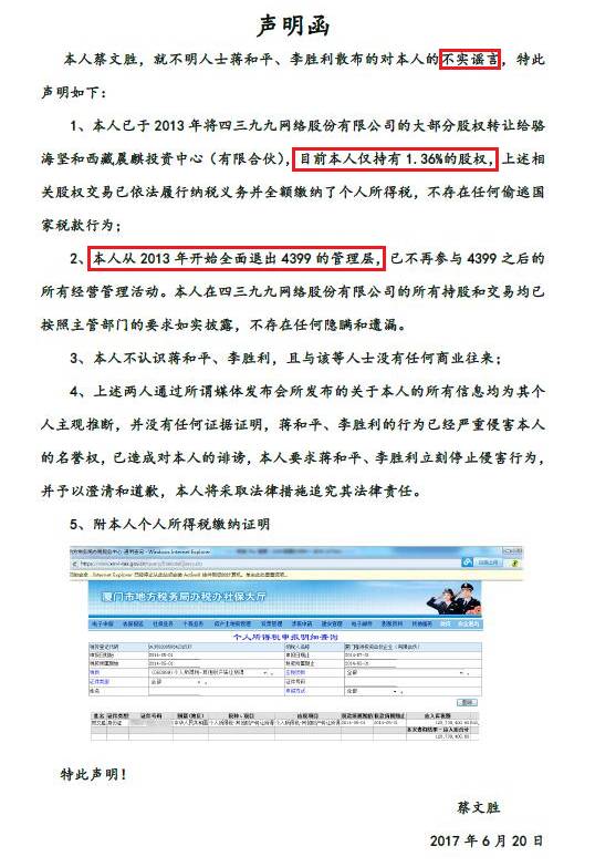 20日晚间,蔡文胜发表声明称,仅持有四三九九1.36%的股权,相关股权交易已依法履行纳税义务并全额缴纳了个人所得税,不存在任何偷逃国家税款行为。声明要求蒋和平、李胜利立刻停止侵害行为,并予以澄清和道歉。蔡文胜声明如下: