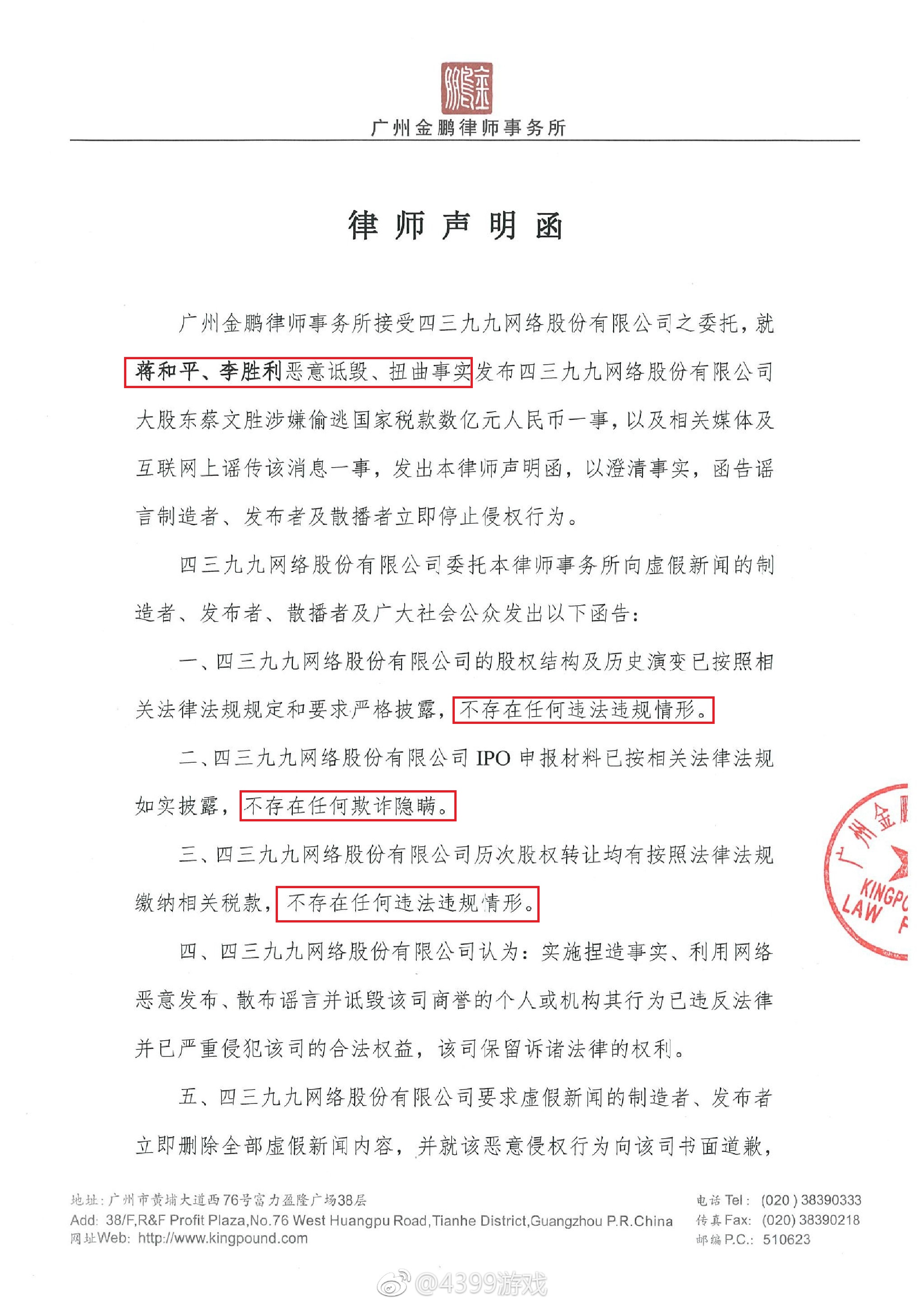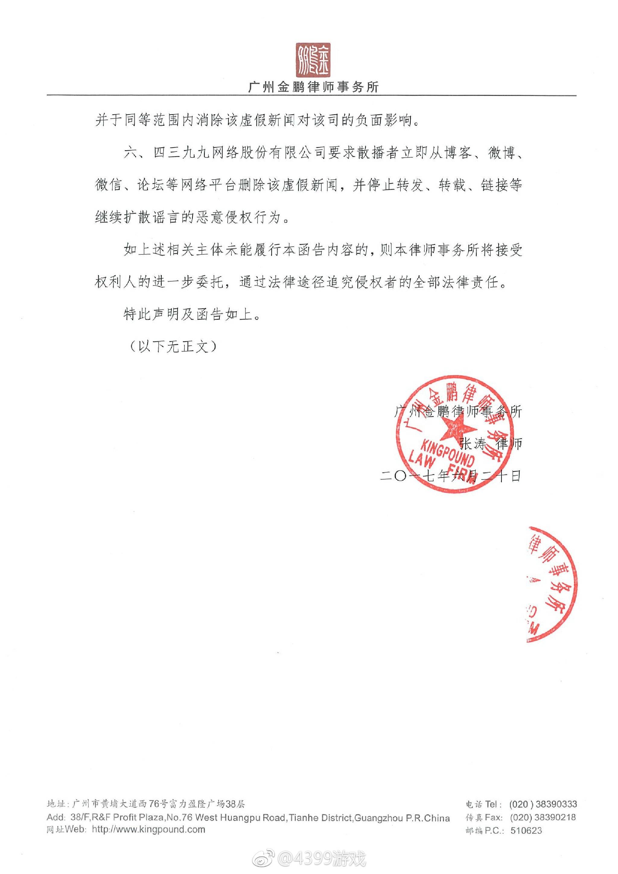 6月20日18点,四三九九在官方微博发布“律师声明函”,内容如下: