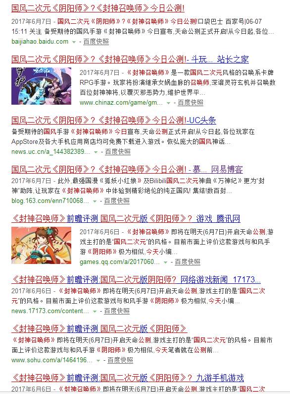 《封神召唤师》在公测预热时期时,在数家大媒体平台发布游戏通稿,标题都以国风二次元版《阴阳师》为标题,疑似想借助《阴阳师》“名气”来获取初期流量。各类游戏文也是或多或少都在和《阴阳师》进行比较来突出《封神召唤师》的某些优势,如更容易获得SSR。