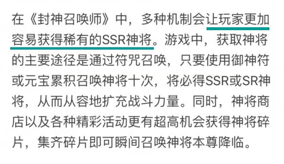 《封神召唤师》正文提到更容易获得SSR,《阴阳师》著名的槽点是SSR非常难得
