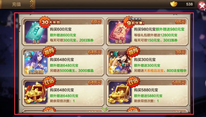 《封神召唤师》说其是一款圈钱一波流手游也为过,月卡、高数量资源、各种各样的充值活动,游戏刚开服不久举行各种充值活动,满满都是套路。游戏的娱乐性并没有想像中的那么好,繁杂的升级路线,多种装备,单一的游戏玩法,有意思的是和其它手游内购项目从低价至高价排列顺序不同,《封神召唤师》价格最低的充值项目放到末尾。这种界面设置的繁杂程度已经到牺牲玩家体验的程度了。