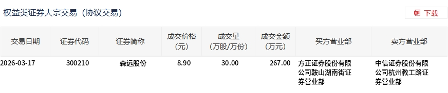 3月17日,森远股份大宗交易成交30万股,成交额267万元,占当日总成交额的4.05%,成交价8.9元,较市场收盘价8.81元溢价1.02%。