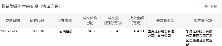 云南白药今日大宗交易折价成交8.34万股,成交额454.53万元