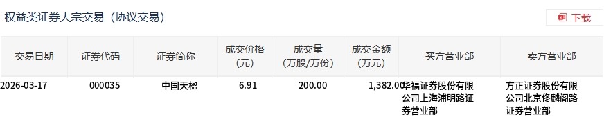 3月17日,中国天楹大宗交易成交200万股,成交额1382万元,占当日总成交额的1.65%,成交价6.91元,较市场收盘价7.38元折价6.37%。