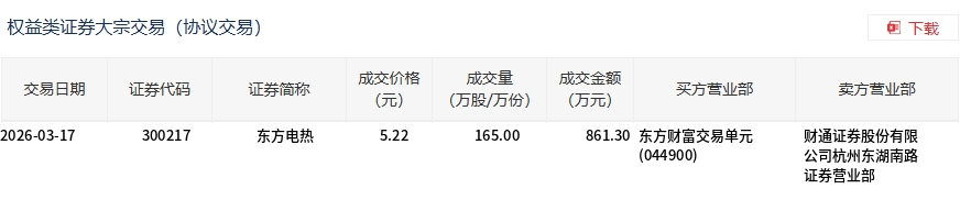 3月17日,东方电热大宗交易成交165万股,成交额861.3万元,占当日总成交额的3.01%,成交价5.22元,较市场收盘价5.45元折价4.22%。