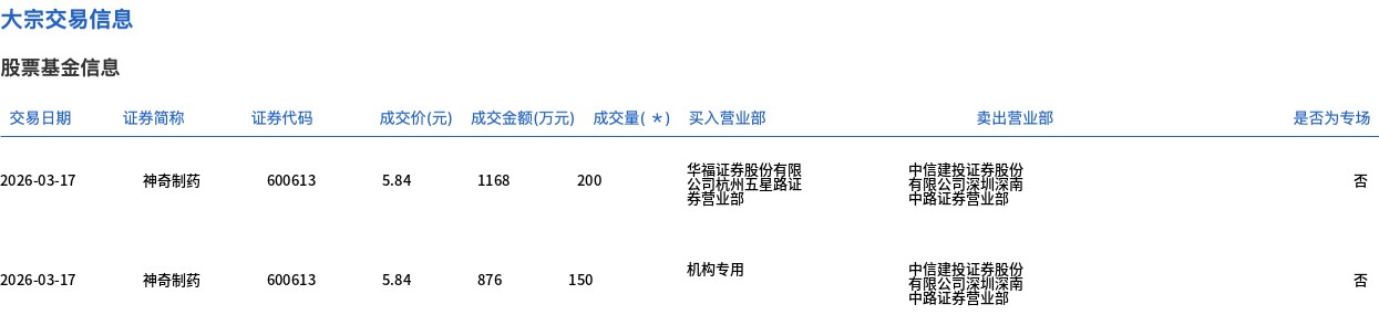 3月17日,神奇制药大宗交易成交350万股,成交额2044万元,占当日总成交额的25.84%,成交价5.84元,较市场收盘价6.21元折价5.96%。