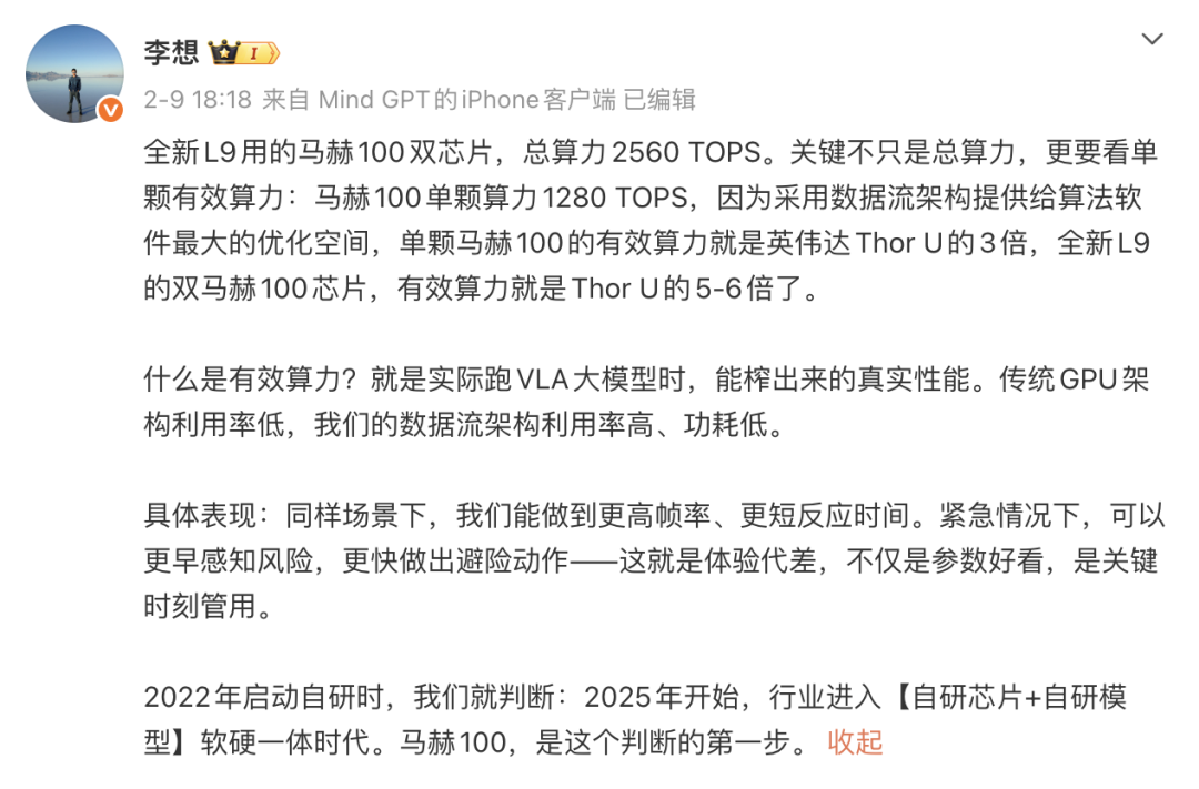 回报已经开始显现,L9 Livis身上被李想称为“最强大脑”的自研5nm马赫100芯片,能够提供三倍于英伟达Thor-U芯片的有效算力,其背后是完整的三年投入周期,根植于一个不符合行业主流认知的判断。