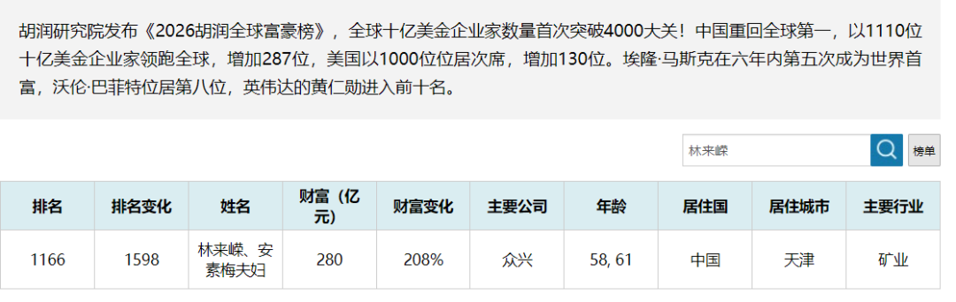 近期入股西贝的大中矿业实控人、贾国龙的“内蒙古老乡”林来嵘今年58岁,胡润研究院发布《2026胡润全球富豪榜》显示,林来嵘、安素梅夫妇财富280亿元,主要公司为“众兴”,榜单排名上移1598名,来到1166名的位置。