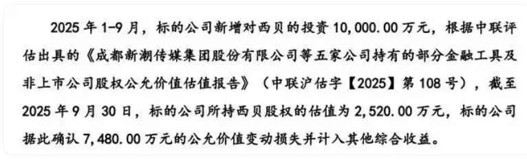 更需要注意的是,上述公告中还同步披露,2025年1-9月,新潮传媒新增对西贝的投资1亿元,估值报告中据此确认了“新潮传媒约7480万元的公允价值变动损失”。