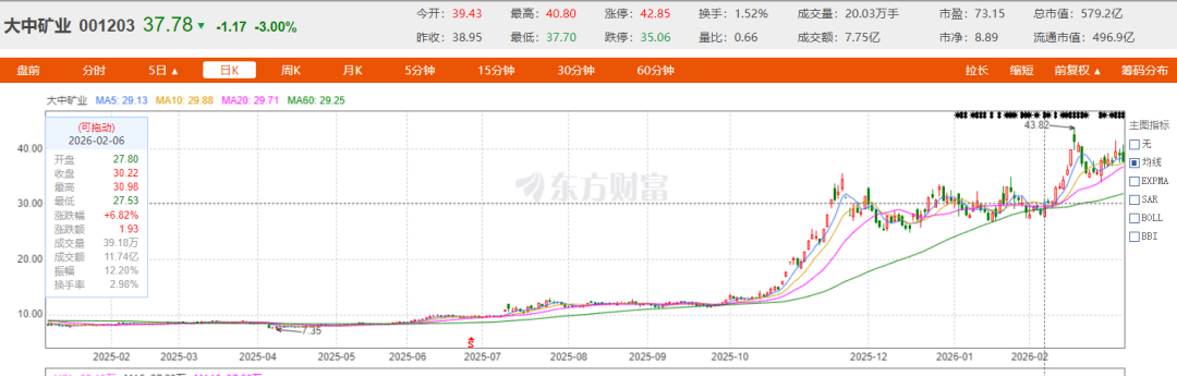 2025年至今,在有色行情带动下,大中矿业股价一度达到历史最高的43.82元/股,相比2025年7.35元/股的最低价,涨幅高达496.19%。截至发稿,大中矿业收盘股价37.78元/股,总市值约579.2亿元。