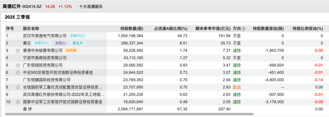 据Wind数据显示,2025年三季度,高德红外前十大流通股东中,除了高德电气、黄立,以及宁波市美森投资有限公司持股没有变动外,有6家股东减持,1家新进。