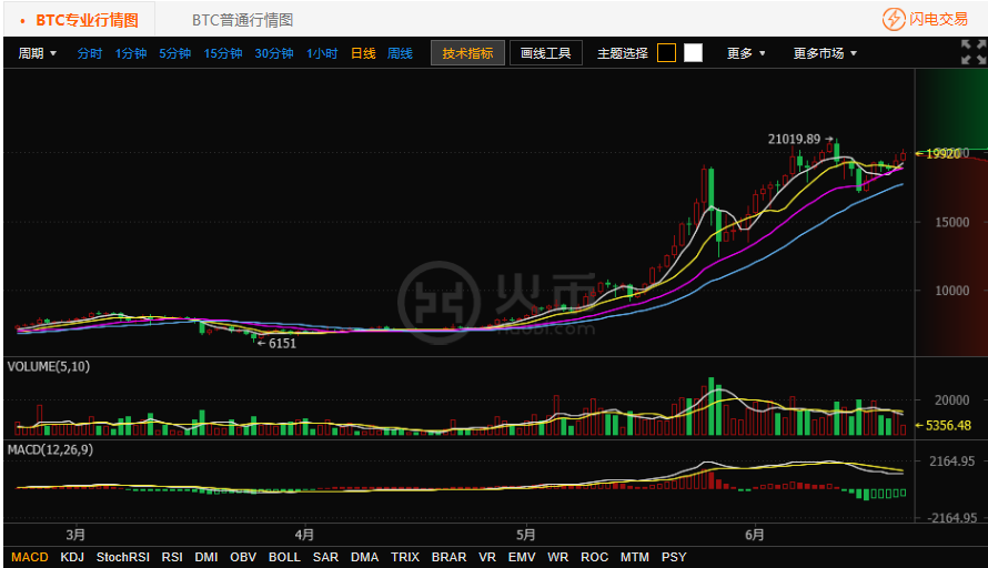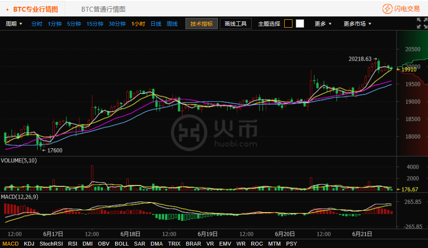 看火币网比特币行情日线图。火币网比特币价格继续沿趋势上涨,继昨日受到MA20支撑后,今日再度上涨,重新站上所有均线,并且成交量温和放大,价格再次逼近20000元关口。看火币网比特币行情小时图。昨日早8时,放量突破平台,此后一路回调至下方平台上沿,在19200元附近反复支撑,最终在晚间开始拉升,从拉升力度看,做多动能有限。因此上方压力还需进一步消化。火币网温馨提示:投资有风险,入市需谨慎。