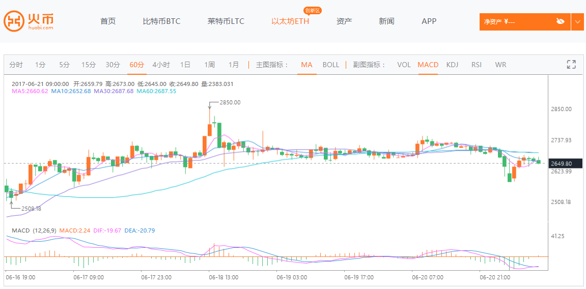 根据以太坊交易平台火币网行情显示,截至北京时间6月21日10点,以太坊价格为2649.8元人民币。火币网以太坊今日开盘价格为2707元,目前最高价格为2709.99元,最低价格为2582元,跌幅2.11%。