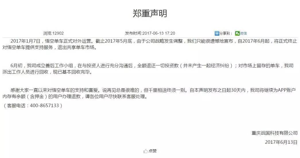 共享单车市场似乎一片欣欣向荣。然而,就在 6 月 13 日重庆的悟空单车却突然宣布终止对旗下单车的维护,成为共享单车行业第一个退出的玩家,悟空单车猝死的原因跟大部分创业团队一样,死于资金问题,没有资本的输血,这家成立不到半年的企业就此倒下。