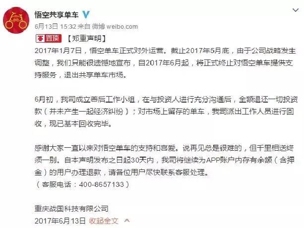 终于,还没等到下一批智能锁共享单车投入市场,悟空单车就撑不下去,连车都不要了:
