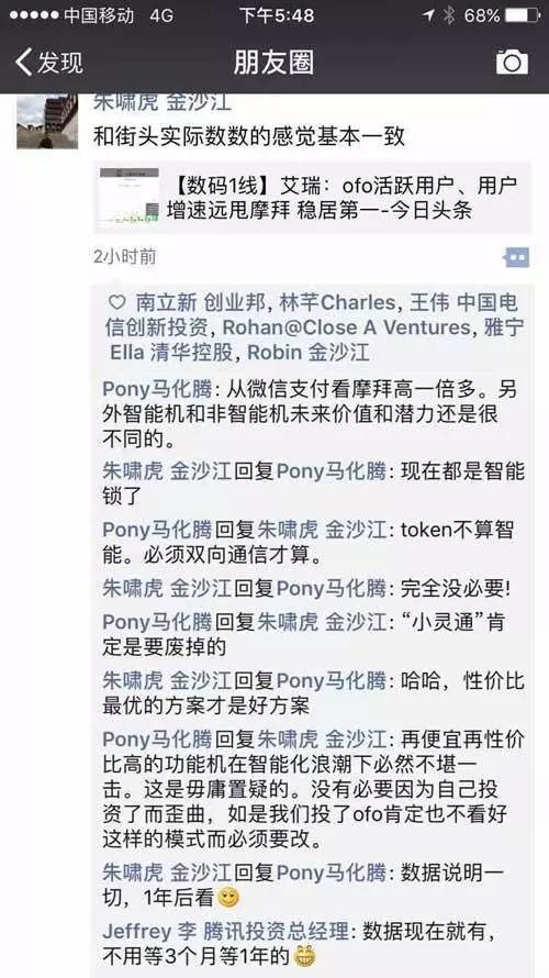 而这些庄家也为了赢下这场赌局,开始纷纷为自己的筹码站台,于是我们便看到了 ofo 投资人金沙江的朱啸虎和摩拜最大的投资人腾讯总裁马化腾在朋友圈的互怼。