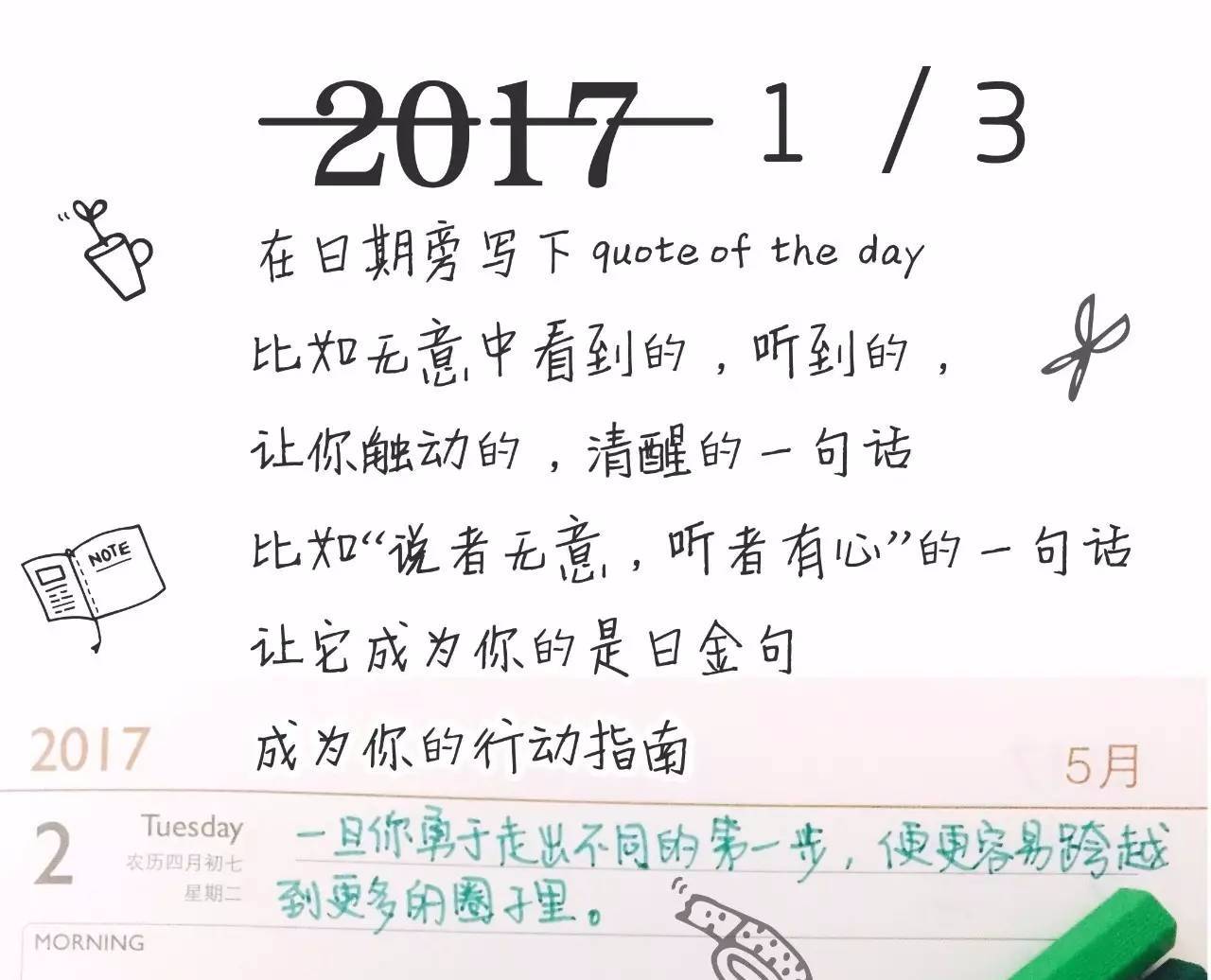 我用的手帐本在每日的日期旁边,留有两行空白,我把这个做成了自己的“小确幸、小幸运、happy moments、quote of the day 专栏”。