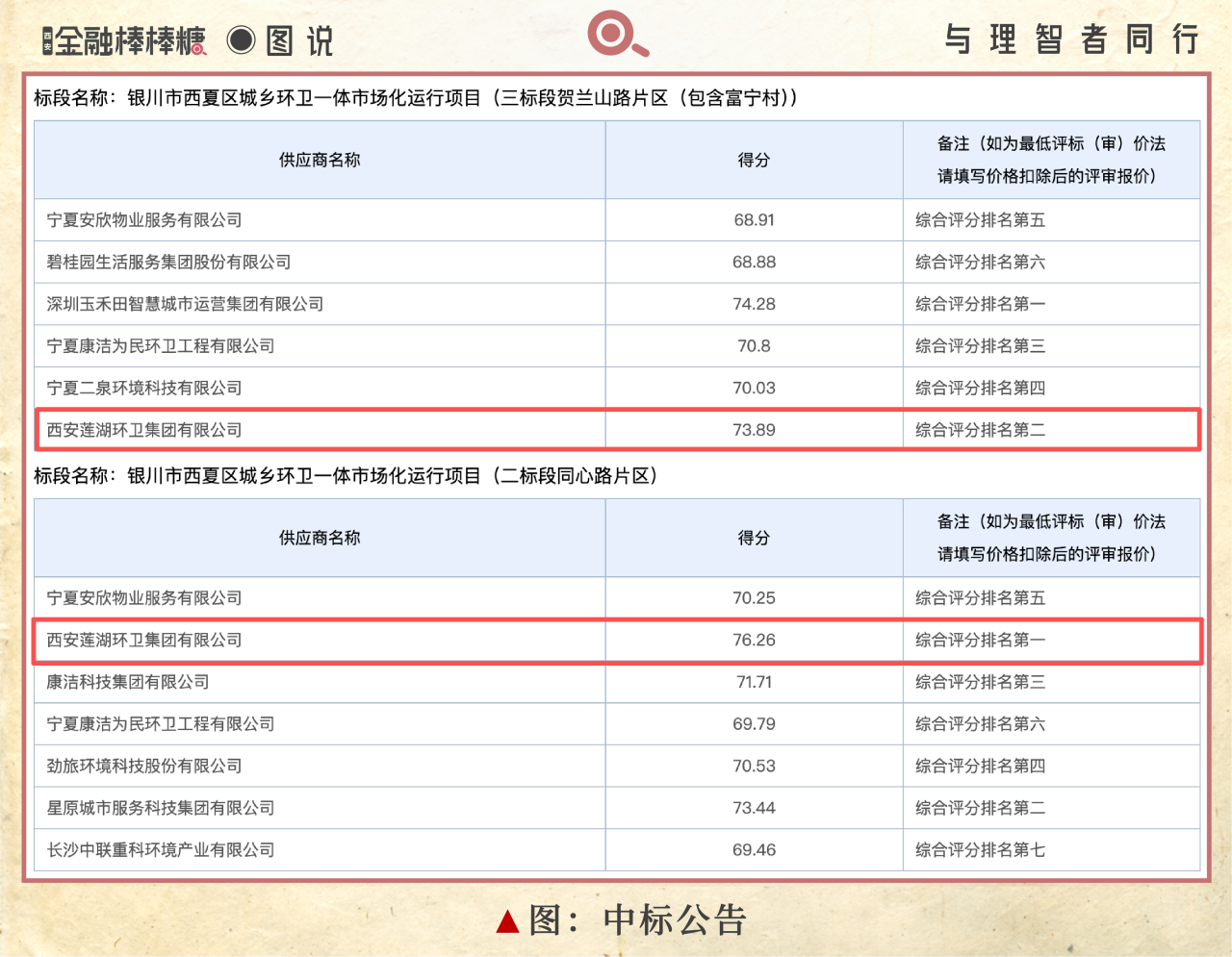 据中标公告,银川市西夏区此次采购分别为六个标段,年化总额为7695万元,3年总金额达2.31亿元。莲湖环卫集团对二、三标段均有投标,不仅以远高第二名2.82分的综合评分中标二标段,且在三标段的6家投标公司中拿下第二名,距离第一名的深圳玉禾田(300815)仅差了0.39分。