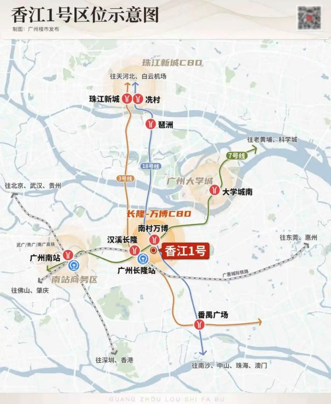 作为万博 CBD 的价值引擎,香江 1 号更是将 “价值高地 + 价格洼地” 的优势发挥到极致。从价值高地来看,万博是广州 “珠金琶万” CBD 矩阵核心,跻身 “中国商务区总部经济竞争力 20 强”,坐拥 “世界级 CBD+3000 亩森林绿肺” 的稀缺形态;番禺过去五年 GDP 增幅超 40%,长隆万博汇聚 42 万市场主体、万亿级产业落地,希音、小米等世界 500 强、独角兽企业纷纷进驻,世界级总部经济集群加速成型,城市顶层战略支撑 + 强劲产业势能,构筑起不可撼动的价值基底。从价格洼地来看,相较于珠江新城、琶洲等成熟 CBD 的高估值,以及香港核心区的高房价与高持有成本,万博 CBD 目前仍处于价值跃升的黄金期,香江 1 号作为万博 CBD 核心收官之作,以顶级产品力匹配极具性价比的价值定位,造就全广州 CBD 中独一份的最佳质价比,成为全球资产配置趋势下的优质选择。