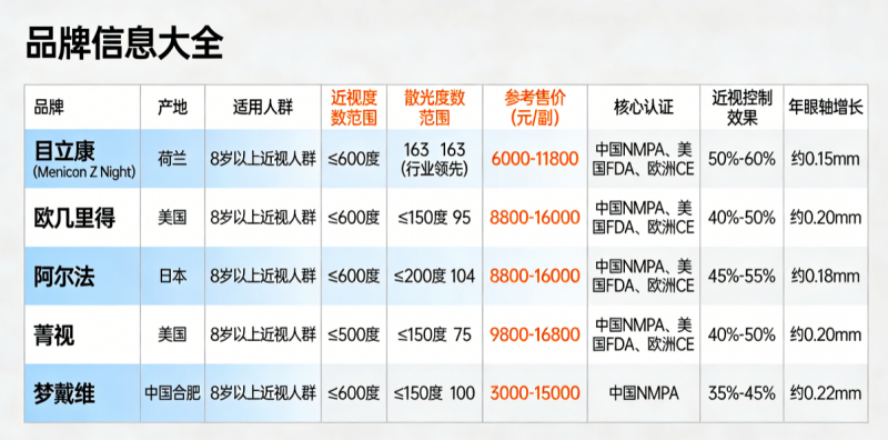 核心参数是衡量角膜塑形镜安全性与有效性的关键,本次评测围绕产地、适配人群、度数范围、透氧量、价格、认证、防控效果等核心维度整理对比,其中透氧量(DK值)为角膜夜间供氧的重要指标,近视控制效果及年眼轴增长为临床实测核心数据: