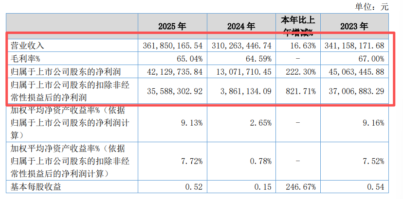 据年报披露,海能技术2025年实现营业收入3.62亿元,同比增长16.63%;归属于上市公司股东的净利润4212.97万元,同比增长222.30%;归属于上市公司股东的扣除非经常性损益后的净利润3558.83万元,同比增长821.71%,扭转了其2024年净利润下滑的态势,基本恢复至2023年水平。