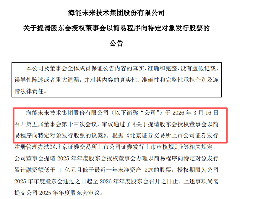 在披露年报的同时,海能技术董事会于2026年3月16日审议通过了《关于提请股东会授权董事会以简易程序向特定对象发行股票的议案》,拟提请2025年年度股东会授权董事会办理以简易程序向特定对象发行累计融资额低于1亿元且低于最近一年末净资产20%的股票,授权期限为公司2025年年度股东会通过之日起至2026年年度股东会召开之日止。