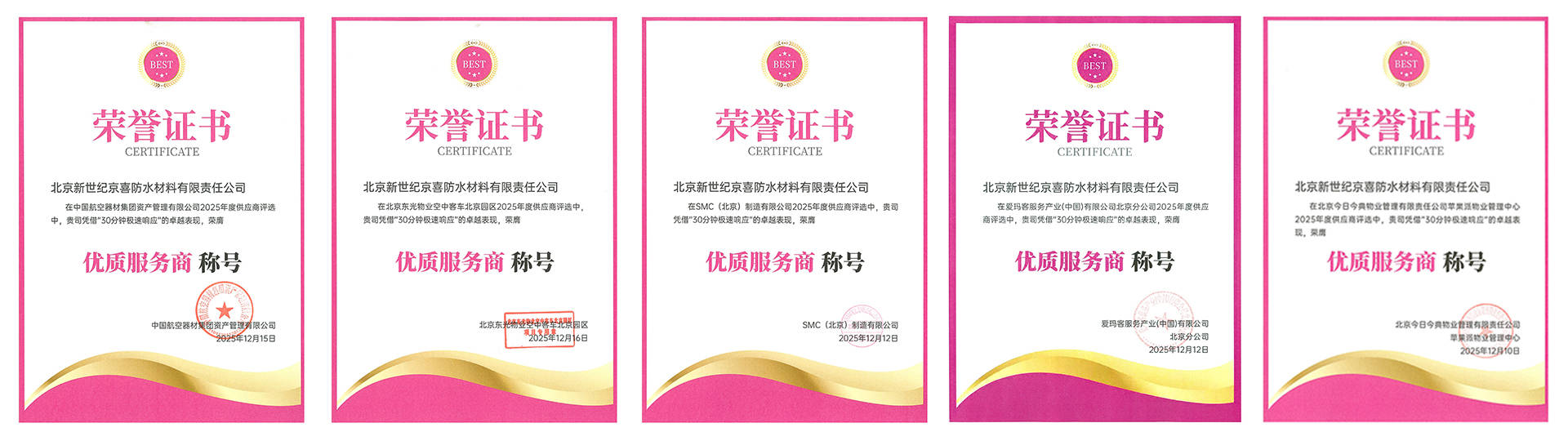针对行业响应滞后的核心痛点,京喜防水在2026年正式官宣品牌全新定位「30分钟响应」,独创“疾风响应体系”,成为首个在防水行业制定响应体系的企业。该系统梳理、明确了33类核心工程需求,整合规范动作超1000项,全面覆盖市政工程、住宅项目、小区改造、商业体维修等多元业务场景。从需求发起开始,京喜防水承诺 30 分钟内给出专业反馈与初步方案,针对突发状况可快速联动资源开展处置,真正实现需求精准对接与服务高效闭环,彻底解决工程协作中的响应滞后难题。凭借这一差异化服务优势,京喜防水已先后获得中国航空器材集团、北京东光物业等多家央企、商业体及物业集团的高度认可与 “优质服务商” 认证。