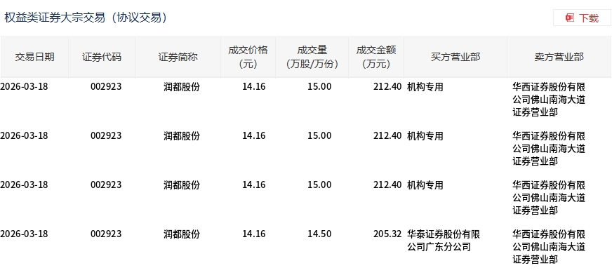 3月18日,润都股份大宗交易成交59.5万股,成交额842.52万元,占当日总成交额的8.7%,成交价14.16元,较市场收盘价15.91元折价11%。