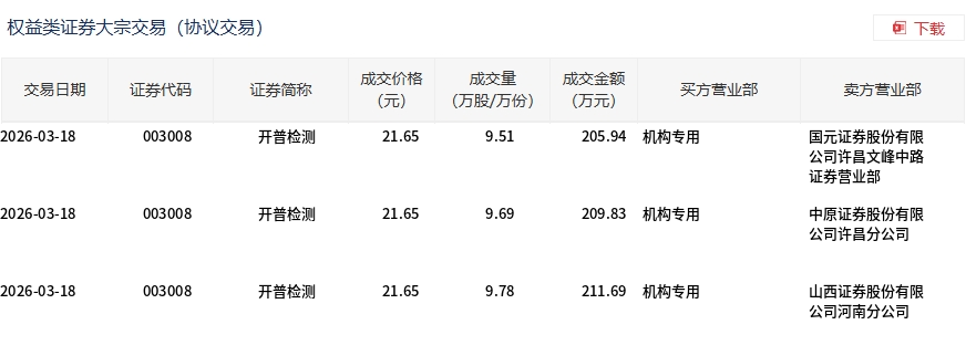 3月18日,开普检测大宗交易成交28.98万股,成交额627.46万元,占当日总成交额的10.78%,成交价21.65元,较市场收盘价24.28元折价10.83%。