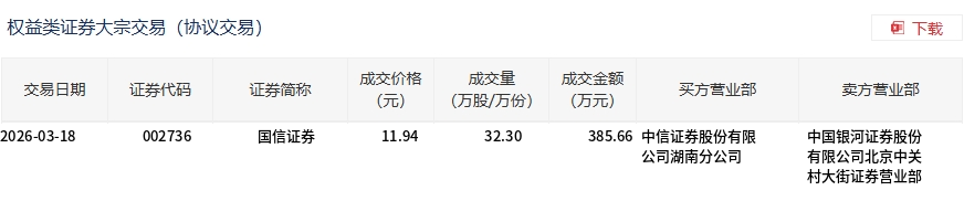 3月18日,国信证券大宗交易成交32.3万股,成交额385.66万元,占当日总成交额的0.34%,成交价11.94元,较市场收盘价12.46元折价4.17%。