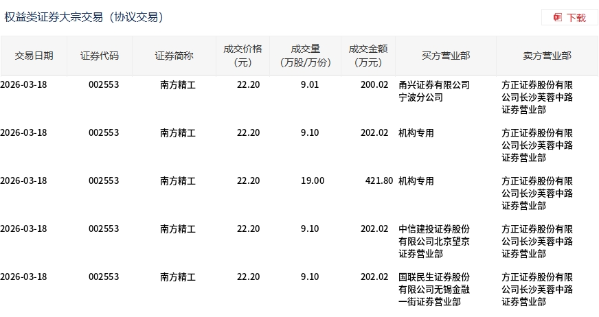 3月18日,南方精工大宗交易成交55.31万股,成交额1227.88万元,占当日总成交额的5.45%,成交价22.2元,较市场收盘价24.29元折价8.6%。