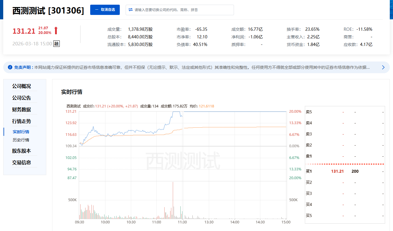 3月18日,A股市场陕西板块表现活跃,西测测试(301306)全天高开高走,强势封死20%涨停板,举成为当日军工检测与商业航天赛道的领涨个股。