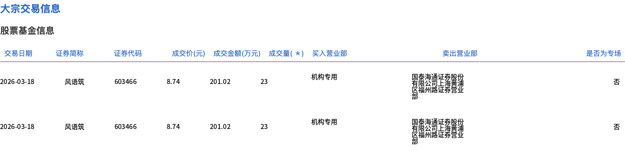 3月18日,风语筑大宗交易成交491万股,成交额4291.34万元,占当日总成交额的18.75%,成交价8.74元,较市场收盘价9.9元折价11.72%。