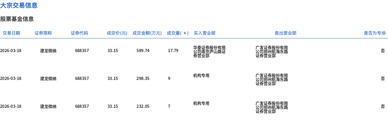 3月18日,建龙微纳大宗交易成交33.79万股,成交额1120.14万元,占当日总成交额的18.72%,成交价33.15元,较市场收盘价36.03元折价7.99%。