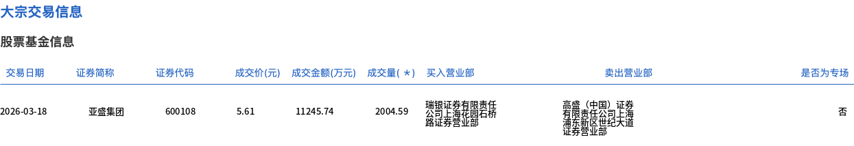 3月18日,亚盛集团大宗交易成交2004.59万股,成交额1.12亿元,占当日总成交额的7.12%,成交价5.61元,较市场收盘价5.61元持平。
