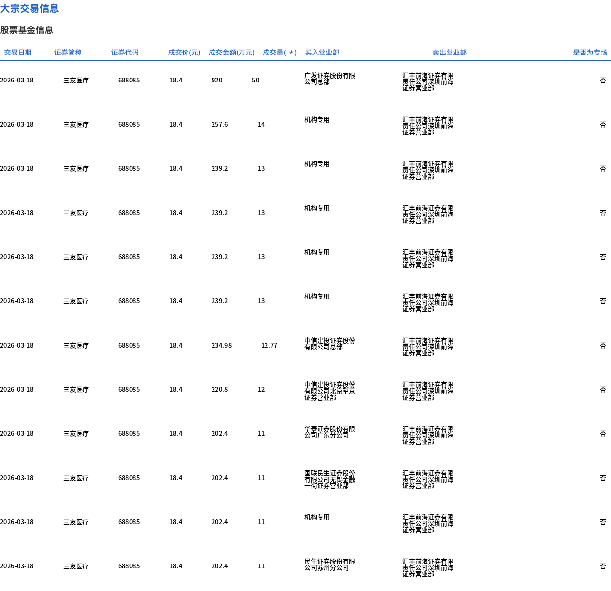 3月18日,三友医疗大宗交易成交184.77万股,成交额3399.78万元,占当日总成交额的50.37%,成交价18.4元,较市场收盘价20.2元折价8.91%。