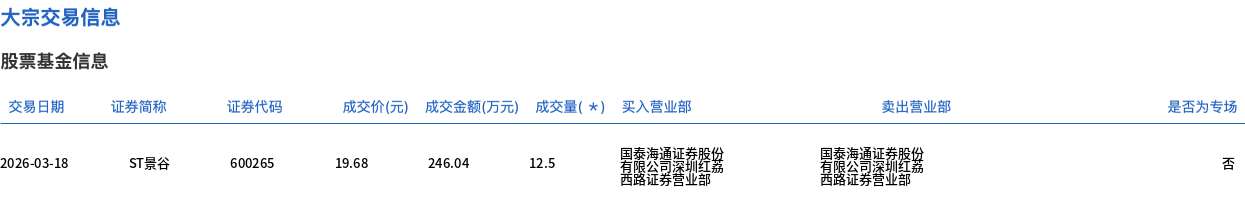 3月18日,ST景谷大宗交易成交12.5万股,成交额246.04万元,占当日总成交额的5.97%,成交价19.68元,较市场收盘价21.4元折价8.04%。