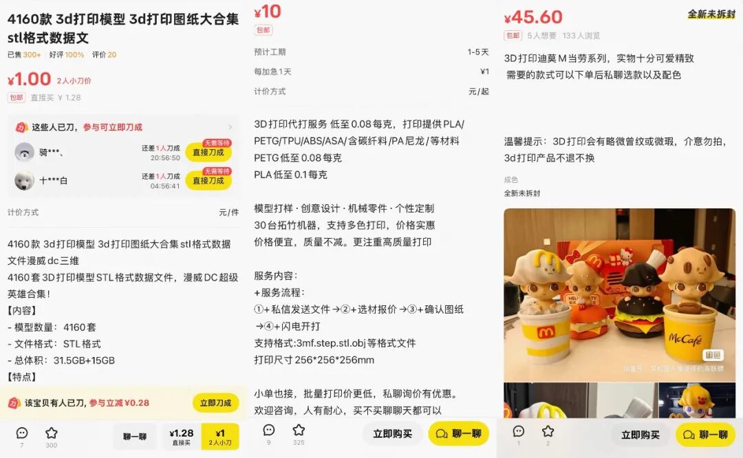 当一部分人还停留在DIY层面,有人已经把3D打印变成了一门生意。在二手市场上,围绕3D打印潮玩,已经衍生出模型文件交易、代打服务和成品售卖等链条,而且价格通常明显低于正版。